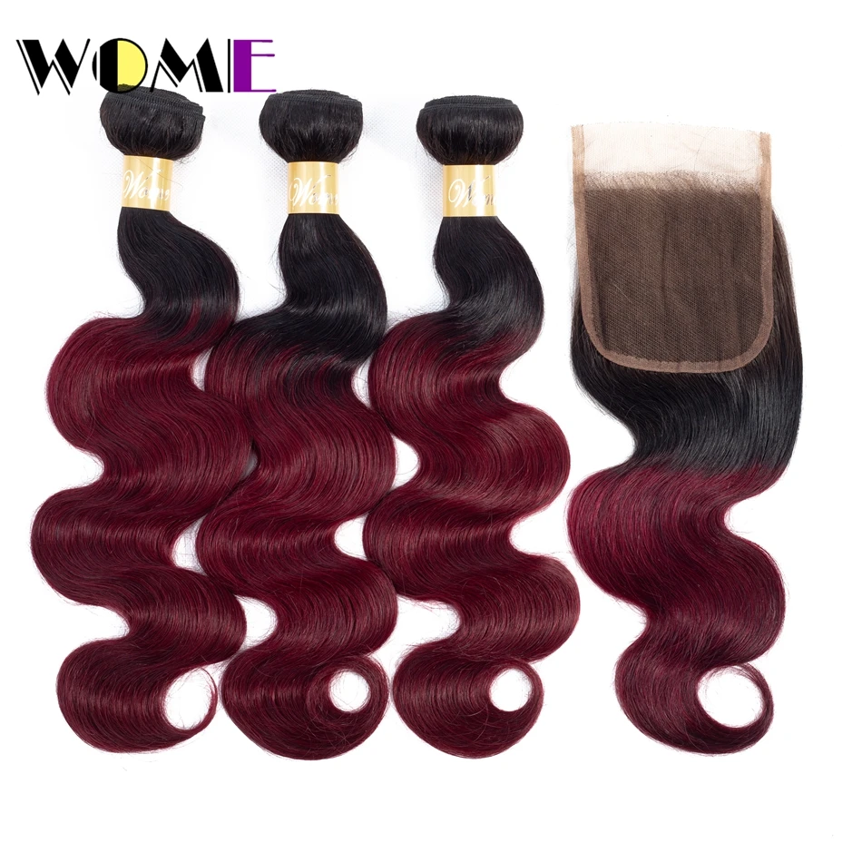 Купить Женские 1B 99J волос Ombre Связки с закрытием перуанский объемной волны 100% человеческих волос 3 Связки с закрытием Nonremy толстые волос Продажа Дешево.