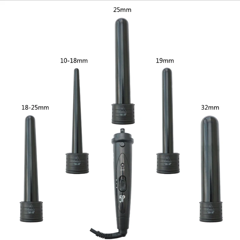 Купить 5 в 1 щипцы для завивки волос Палочка Набор с 5 сменных бигуди керамические бочки и защитные перчатки, черный ЕС Plug Продажа Дешево